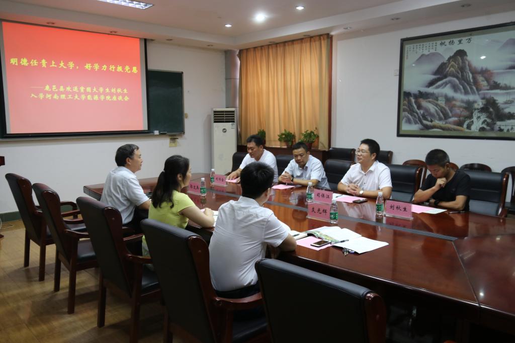 会议伊始,郭文兵向与会人员介绍了学院基本情况,并对刘秋生同学能入学学院表示欢迎,并表示学院将与县里多沟通、多联系,给予刘秋生同学更多的帮助,使他能心无旁骛地安心学习。随后,冯涛和刘作全介绍了刘秋生的家庭基本情况,秋生同学虽家庭贫困,但对生活乐观积极、对学习认真刻苦,报考学院采矿工程专业是孩子高考填报志愿时多方比较后的主动选择。紧接着,支光辉介绍了我校贫困生的资助体系和学校学院设立的各项奖学金,并鼓励秋生同学勇于克服困难、磨练意志,用知识丰富自己,健康生活成长。刘秋生表示,非常感谢党和政府的关怀与资助、父老乡亲们的支持与帮助、父母的养育与付出、学校的温暖与鼓励,在校期间必将心怀感恩、牢记嘱托、努力学习,以优异的成绩回报党和社会。