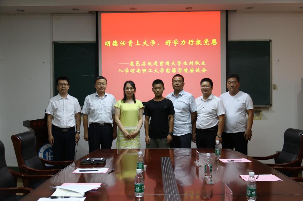 精准帮扶贫困生,大爱育人暖人心。9月6日下午,学院在院楼201会议室召开“明德任责上大学,好学力行报党恩”--鹿邑县欢送贫困大学生刘秋生入学新葡萄8883官网AMG座谈会。周口市鹿邑县县委组织部驻村办主任冯涛、鹿邑县邱集乡夏庄村第一书记刘作全、夏庄村支部书记司保江,老版新葡萄8883官网党委书记王婕、院长郭文兵、副书记支光辉,学院2018级采矿工程专业新生刘秋生参加会议,会议由王婕主持。