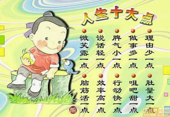 人生十点 理由少一点,胆量大一点; 脾气小一点,微笑露一点; 说话轻一点,赞美多一点; 做事勤一点,行动快一点; 脑筋活一点,效率高一点.