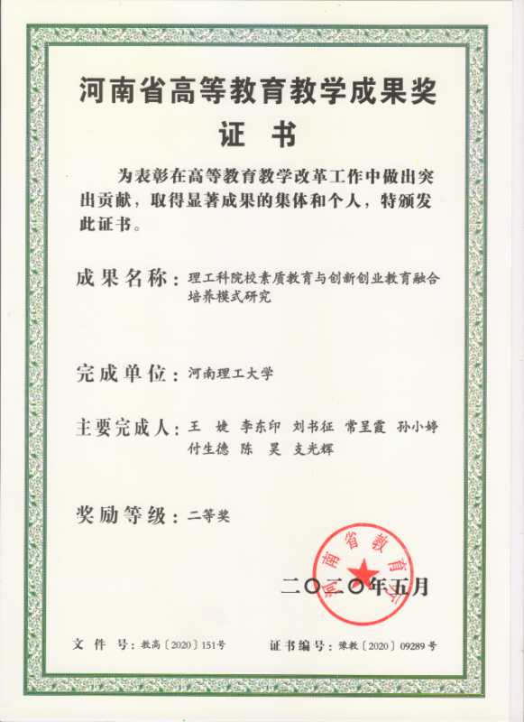 根据《河南省教育厅关于公布2019年度河南省高等教育教学成果奖获奖项目的通知》(教高〔2020〕151号)文件通知,我院王婕、李东印主持的《理工科院校素质教育与创新创业教育融合培养模式研究》获河南省高等教育教学成果奖二等奖。