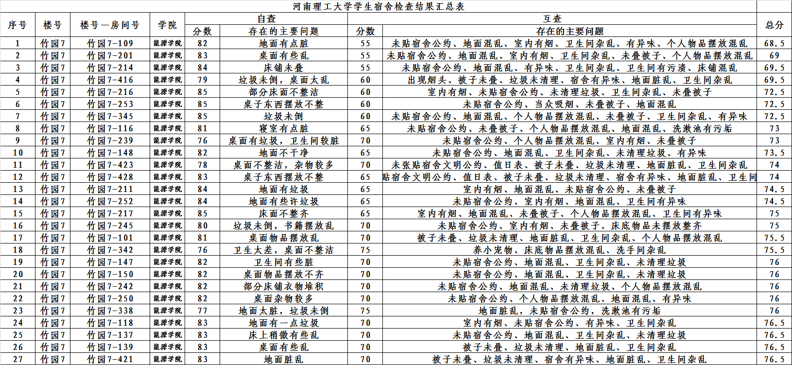 各位同学: 2021年11月份的宿舍卫生环境检查工作已经结束。根据新葡萄8883官网AMG自查和其他学院互查的得分,现将总得分排名在学院后10%的宿舍进行通报。请同学们相互转告,被通报的宿舍进行限期整改。